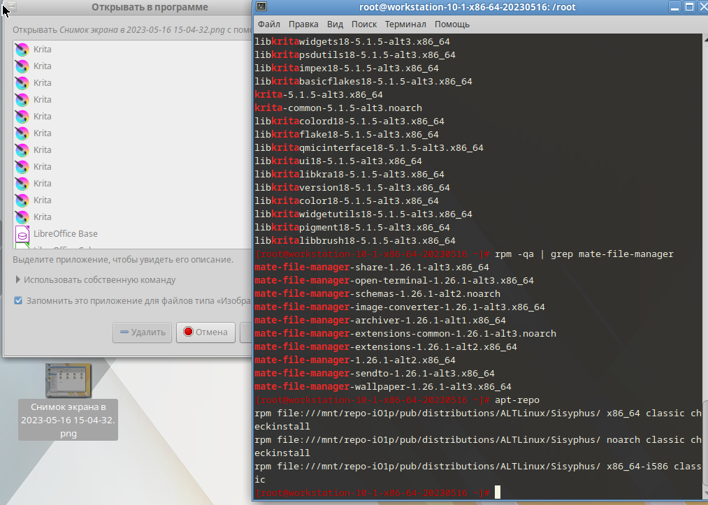 Created attachment 13201 [details] Скрин Тестовый стенд p10 workstation x86-64 обновленный до Sisyphus rpm -qa | grep krita krita-5.1.5-alt3 rpm -qa | grep mate-file-manager mate-file-manager-1.26.1-alt2 Шаги воспроизведения: 1. Установить программу: # apt-get install krita. 2. Нажать ПКМ по любому файлу, например, по картинке -> Открыть с помощью/Открыть в другой программе -> Выбрать в списке krita. Ожидаемый результат: Наличие одного экземпляра программы krita. Фактический результат: Наличие множества экземпляров программы krita. Приложен скрин, см. вложения. Воспроизводится в р10: krita-5.1.5-alt2 mate-file-manager-1.26.1-alt2 Не воспроизводится в р10 kworkstation, р10 education kde. См. https://bugzilla.altlinux.org/show_bug.cgi?id=46155#c1