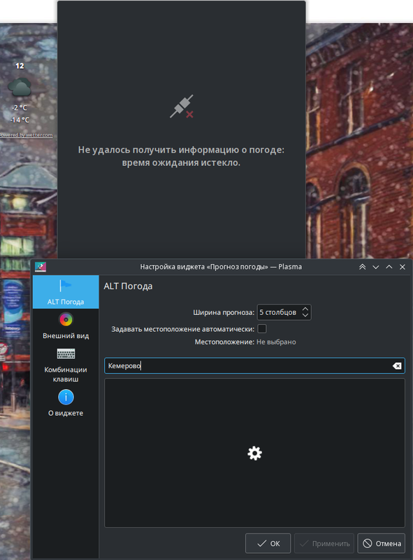 Виджет ALT погода не работает. При попытке ввести город, висит шестеренка. Автоматически тоже не определяет. https://i.postimg.cc/wT4Ws5pB/Screenshot-20240310-103618.png Операционная система: Sisyphus 20240122 Версия KDE Plasma: 5.27.10 Версия KDE Frameworks: 5.115.0 Версия Qt: 5.15.12 Версия ядра: 6.6.21-un-def-alt1 (64-бита) Графическая платформа: X11 Процессоры: 8 × Intel® Xeon® CPU E3-1270 V2 @ 3.50GHz Память: 31,3 ГиБ ОЗУ Графический процессор: llvmpipe